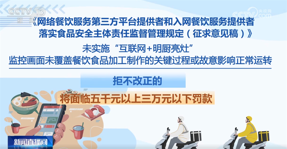 按照收罗看法稿,平台收到市场监视办理部分关于入网餐饮办事供给者违法违规行为消息等传递未采纳响应办法的;采纳办法后私行恢复入网餐饮办事供给者线上运营办事的;以及未将入网餐饮办事供给者运营天分取省级市场监视办理部分从体天分消息进行校验比对等行为将面对五万元以上二十万元以下罚款。画面未笼盖餐饮食物加工制做的环节过程或居心影响一般运转,拒不更正的,将面对五千元以上三万元以下罚款。
