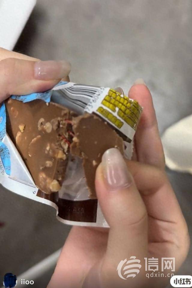 据当事人描述,她于10月20日采办巧克力后,拆袋即食用,吃到半途发觉一块巧克力无法掰开,细心一看,本来是有一根形似红色皮筋的异物。